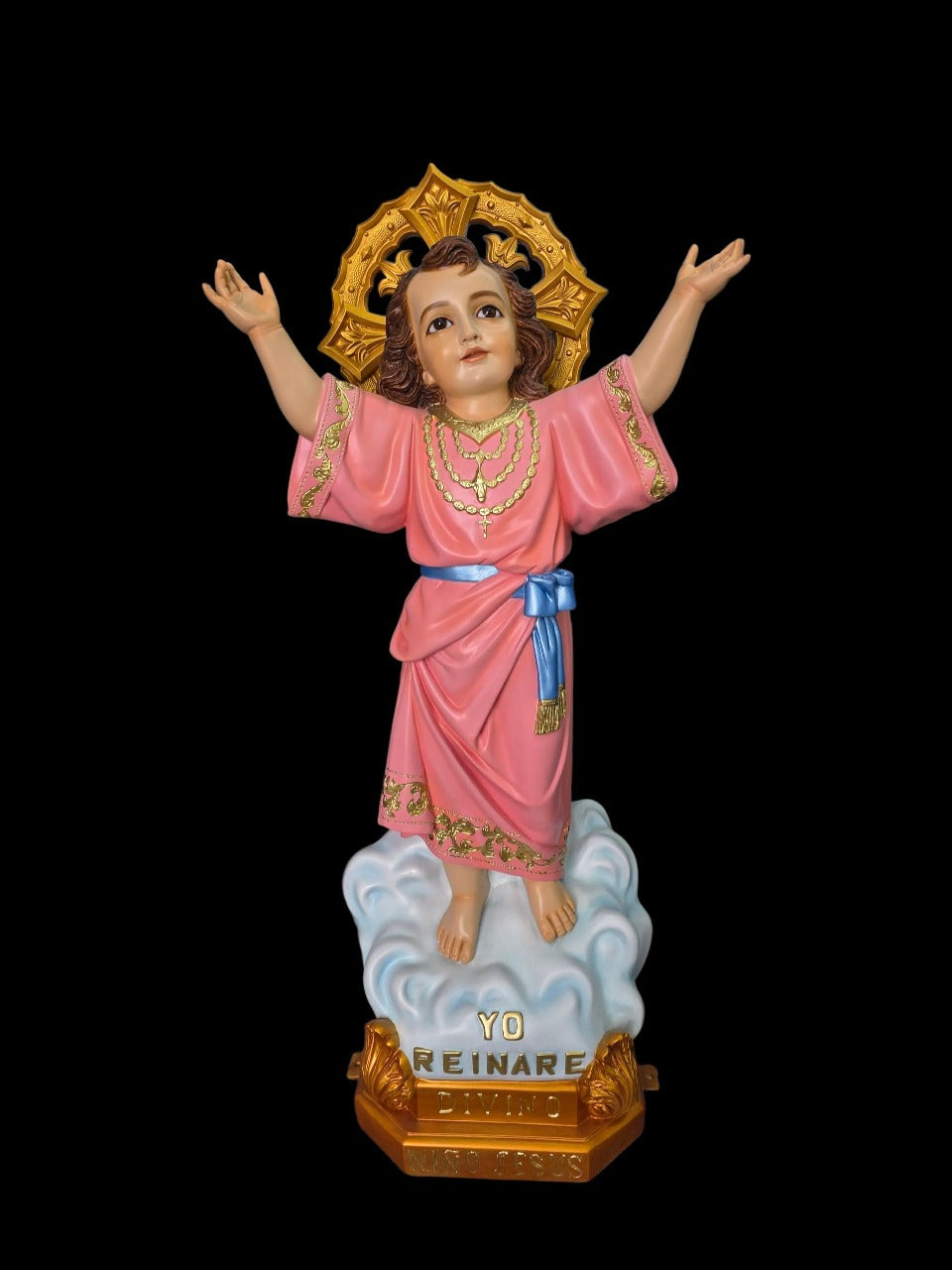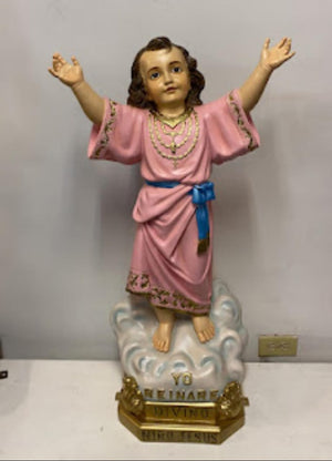 Divine Child 38" statue beautifully depicts the infant Jesus with exquisite detail and craftsmanship. Standing 38 inches tall, this religious sculpture includes a large ornate fiberglass halo and features customizable English text on the base. Perfect for churches, shrines, or devotional spaces seeking a meaningful focal point for prayer and worship. Does not include metal crown only resin crown with the price.+++