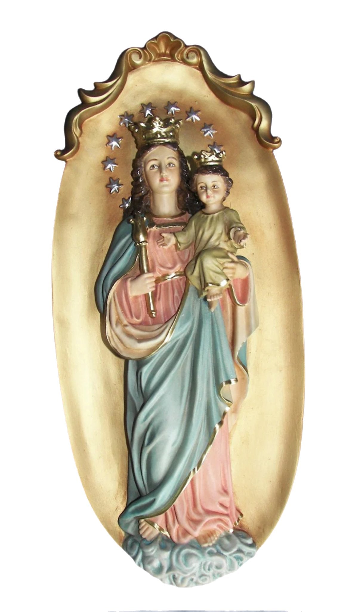 The Help of Christians 14" plaque statue is a beautifully crafted representation of religious art, showcasing the skill and devotion of our master artisans. Meticulously made from high-quality materials and refined with expert techniques, this statue reflects the unparalleled standards of Fiat Religious Statues. Elevate your sacred space with this meaningful work of art, and invite both aesthetic beauty and spiritual grace into your home or place of worship.